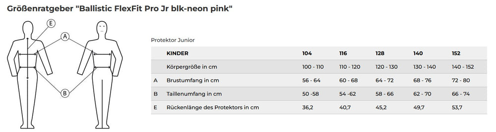 - 152: Körper 140-152 cm / Brust 72-80 cm / Taille 66-74 cm / Rücken 53,7 cm